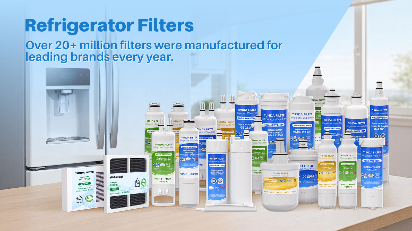 • [Authoritative Certification] YUNDA refrigerator water filter bears major Authoritative Certifications on markets, such as NSF/ANSI 42 & 372 Lead-Free from NSF and IAPMO, European Food Grade Regulations EC-1935/2016, ROHS, REACH, BPA-Free, TUV and Australian Water Mark.