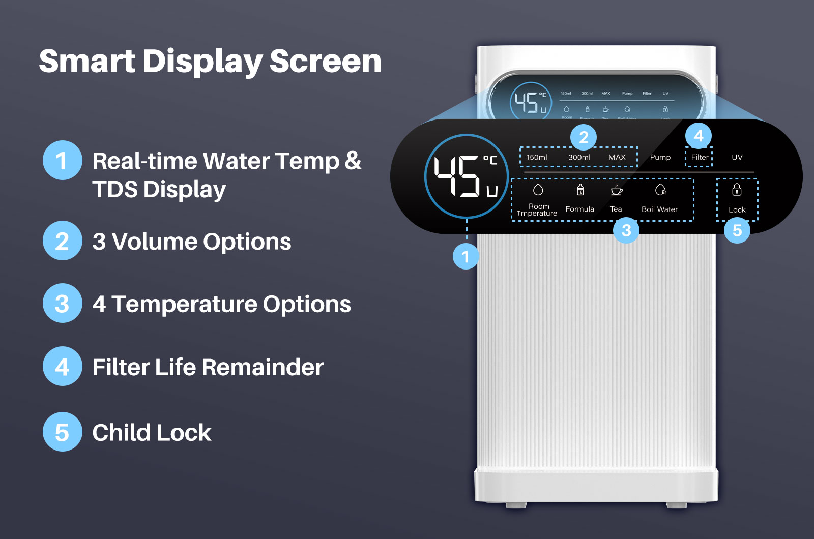 【Real-Time Monitoring and Safety Features】The smart panel of the countertop reverse osmosis system offers real-time monitoring of filtered water TDS levels, along with temperature display and low water level reminders. Additionally, enjoy customizable dispense volume and added peace of mind with the child safety lock feature.