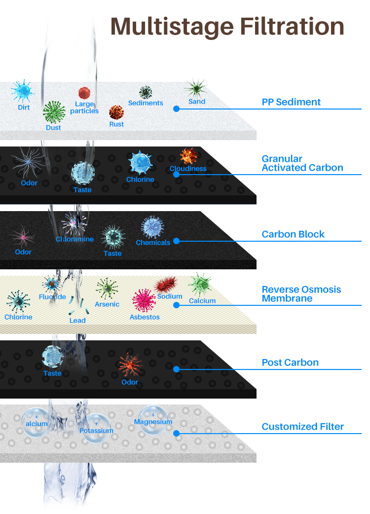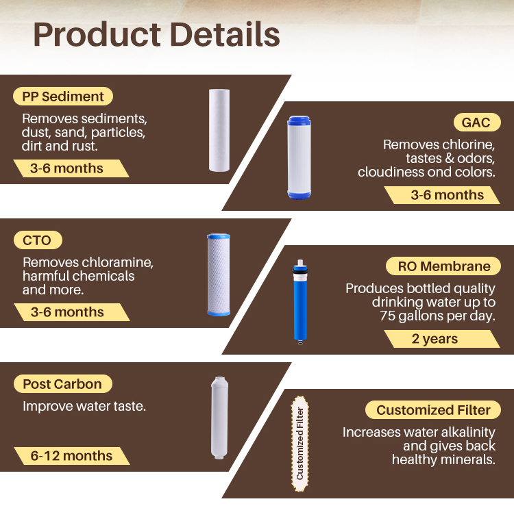 • [Filter Lifetime and Replacement] PP filter, granular activated carbon, carbon block filter 3 to 6 months, and post-carbon filter 6 to 12 months. RO filter 2 to 3 years lifetime.