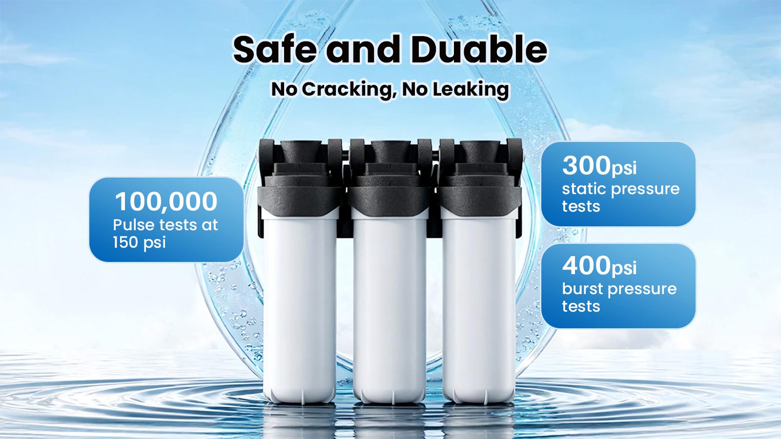 【Combines modern design and Durable Construction】The under-sink water filter adopts strong materials with an upgraded design. In addition, the age-resistant and freeze-resistant materials make the system twice thick. The under-counter water filter system for the kitchen has also passed 400 psi burst pressure, 100,000+ pulse tests at 150 psi, and static tests at 375 psi. These tests prove that the durable integral design clears up worries about cracking cases and leaking issues