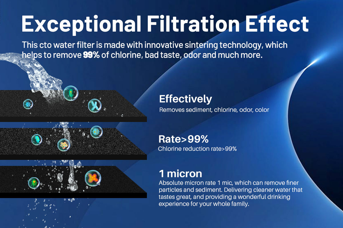 • [Powerful Filtering] This filter is made with innovative sintering technology, which helps to remove 99% of chlorine, taste, and odor. This filter can remove finer particles and sediment.
